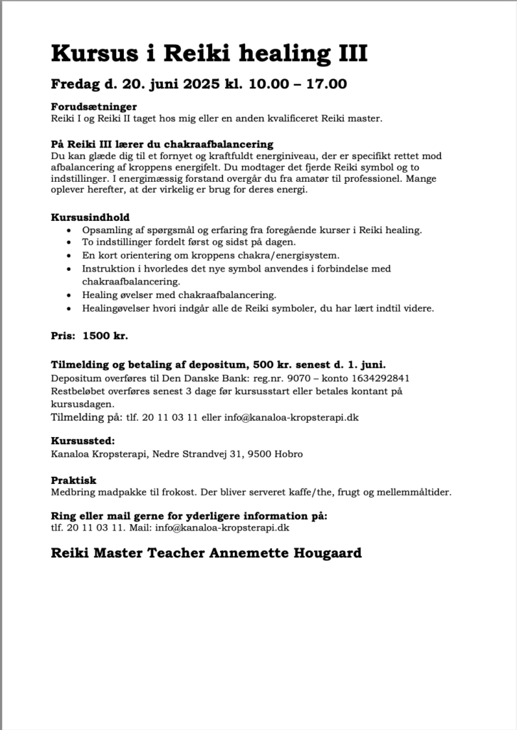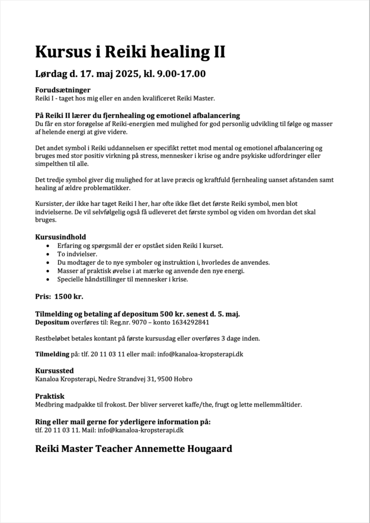 - Reiki I begynderkursus: d. 26. og 27. april 2025.